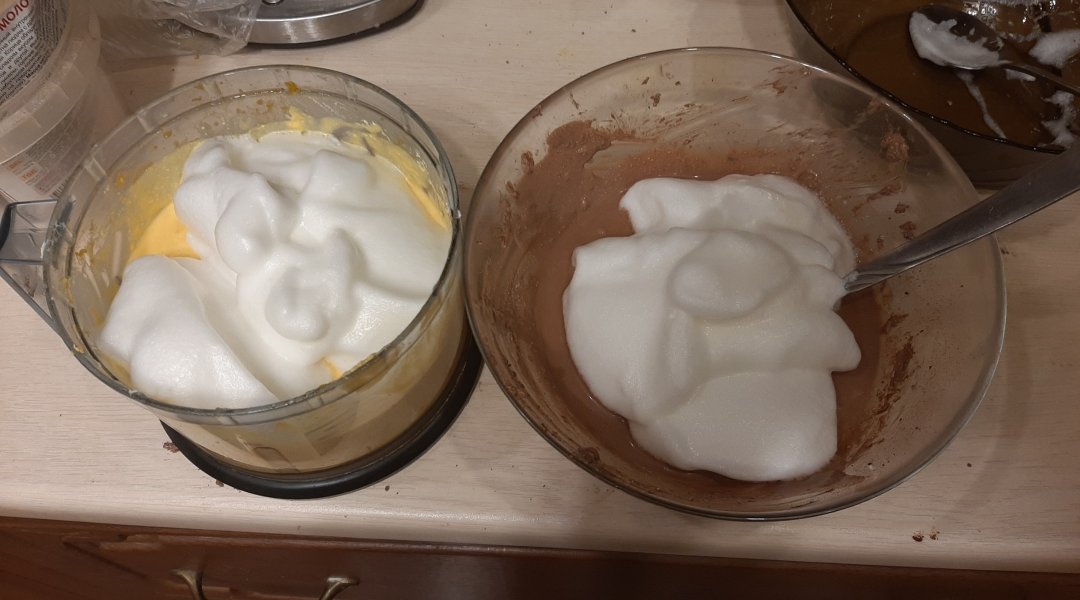 Взбитый белок разделить на 2 равные части. Добавить их в оранжевую