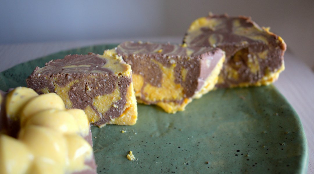 Растопленный желатин разделить на 2 равные части. Добавить их в