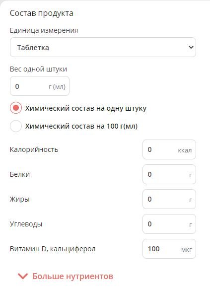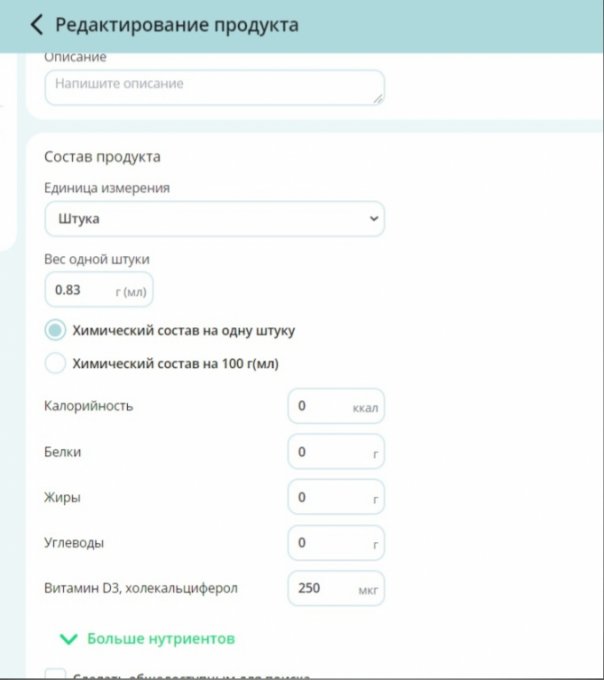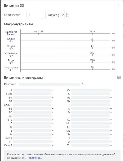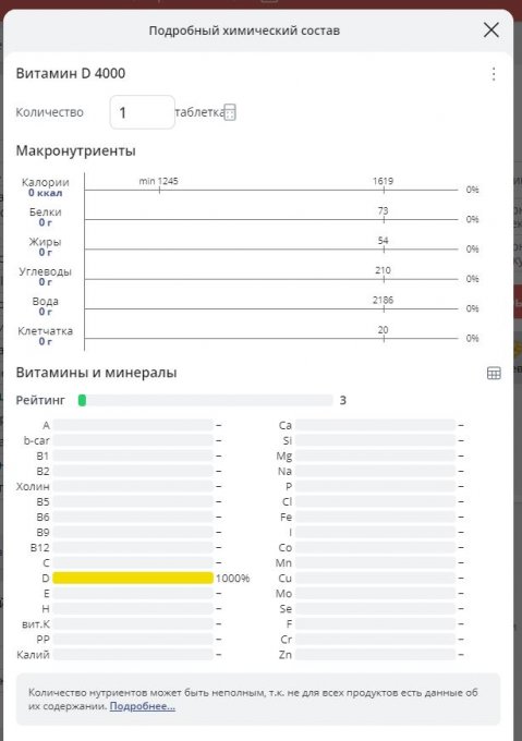 Перепроверь единицы измерения витамина в нутриентах созданного под него продукта.