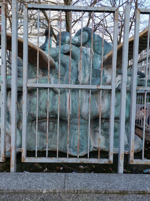 Недалеко от танцстудии обнаружила странную скульптуру, в сумерках не могла понять - что за зверь такой апокалиптический - крылья, змеи, хвосты, все животные в кучу. Да еще за толстыми решетками всё. Посмотрела в википедии. Оказалось - голова Медузы Горгоны. Наваяли французские скульпторы Анна и Патрик Пуарир. За решеткой - (для впечатлительных граждан) из-за тех.неполадок фонтана.