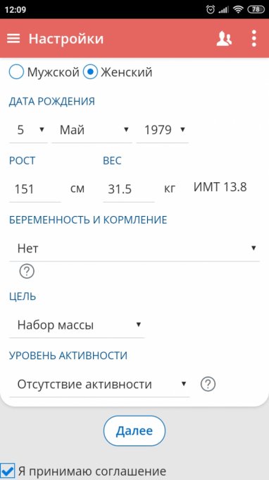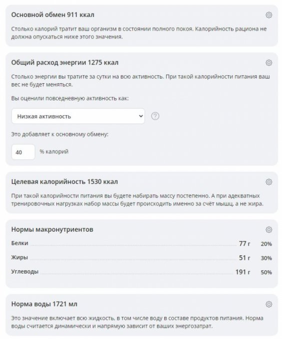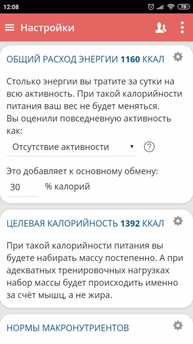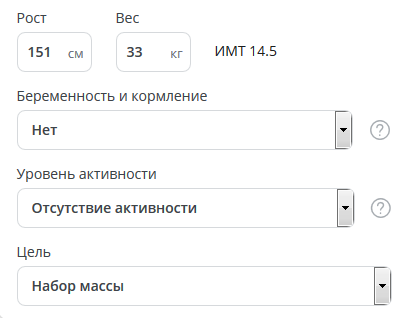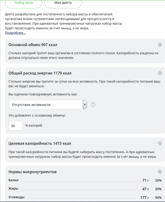 набрать, тогда вам программа рассчитает 1450 калорий в день.
