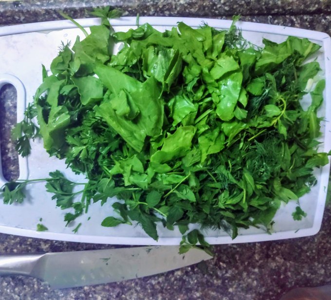 Нарезаем подготовленную и помытую зелень. У меня идет петрушка, укроп, кинза, шпинат, латук и мята. Режем средне-крупно. Так будет вкуснее. Добавляем к луку и тоже немного обжариваем, совсем чуть-чуть. . А я тем временем иду и делаю 200 схлопок на косые мышцы типа "Лягушка". Ну, типа, чтобы заслужить жратву