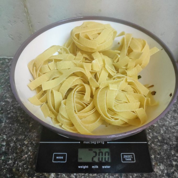 Взвешиваем 200 грамм лапши и добавляем в кастрюлю. И туда же идет ложка куркума. Программа "варка" 7 минут.