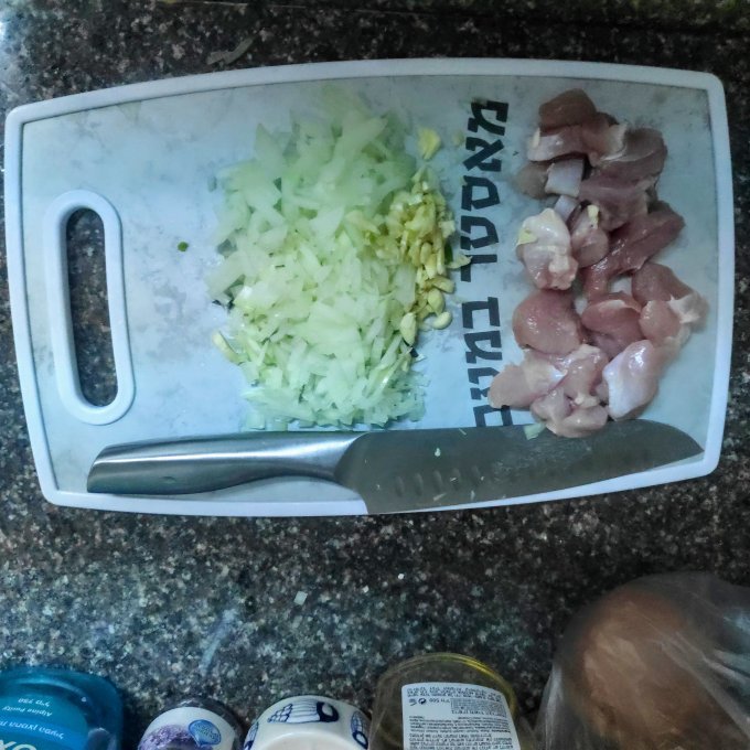 Берем 1-2 луковицы в зависимости от размера и мелко нарезаем. Чистим 3-4-5 (я делаю побольше) чеснока. Разбиваем и мелко нарезаем тоже. Вообще Ашереште готовится без мяса, я извращенец и гурман, поэтому добавил 200 грамм индейки, чтобы было поинтреснее.