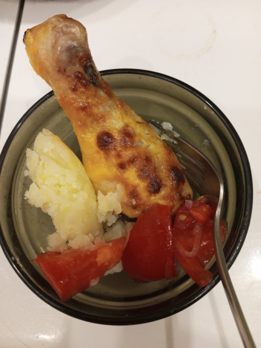На фото мой обед. Курица не жареная, а просто запеклась в духовке