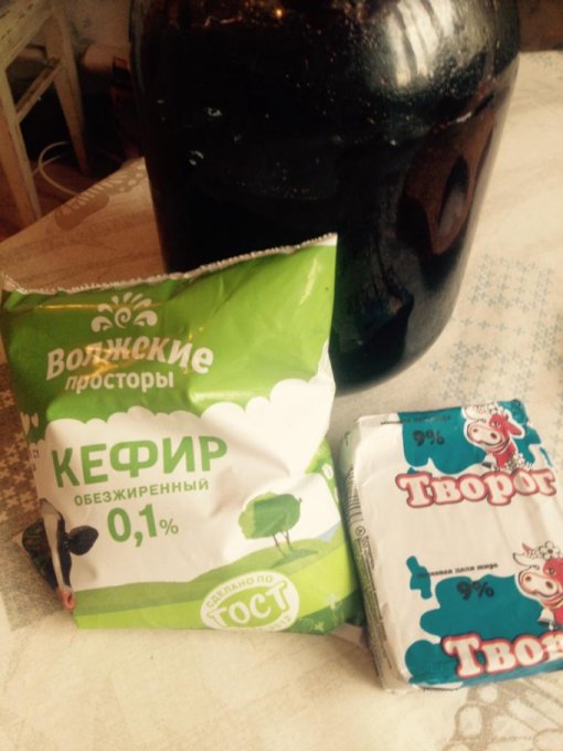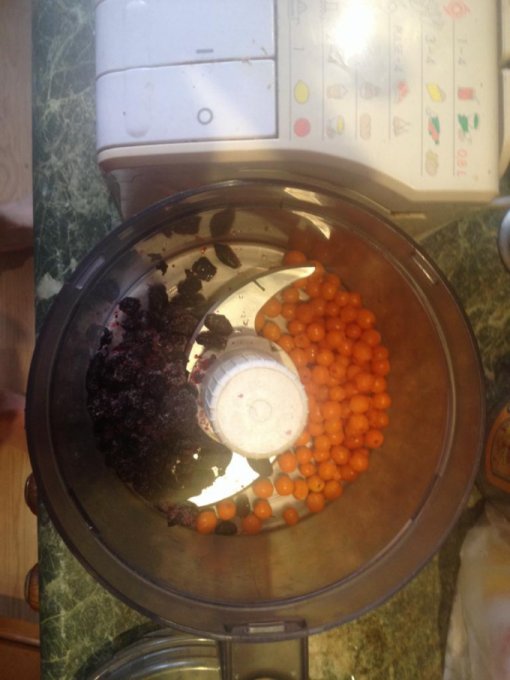 мороженную жимолость  и облепиху засыпаем в комбайн заливаем теплой водой , наливаем кефир кидаем творог и черную смородину протертую с сахаром. Включаем комбайн все перемешиваем и продукт готов.