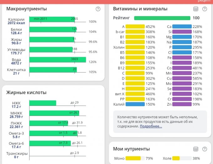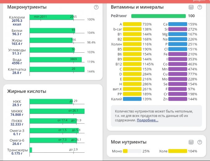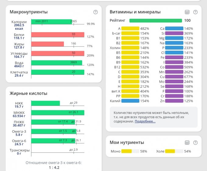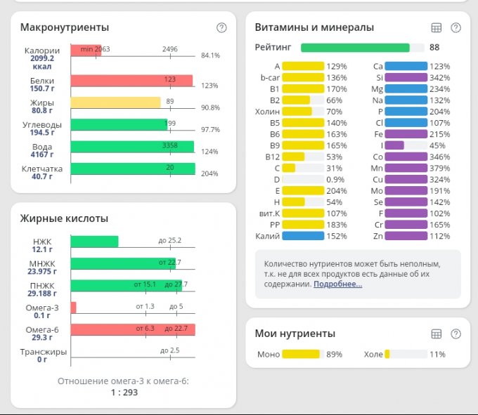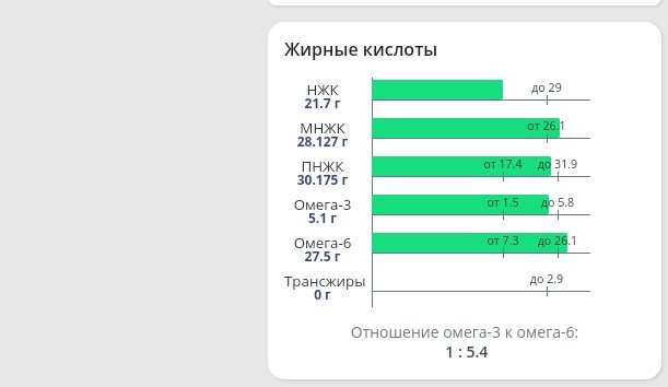После двухдневного голодания питался несколько дней без программы. Перехал по обстоятельством в пригород. Только сегодня добрался до планшета еле подключился к инету. Кое как собрал продукты нужные и вроде получилось:-) Добавить фотку жирных кислот за сегодня не научился ещё с планшета ,пока научился фотку с экрана сделать и с трудом нашел ее , ну тоестьь место куда она сохранилась:-)