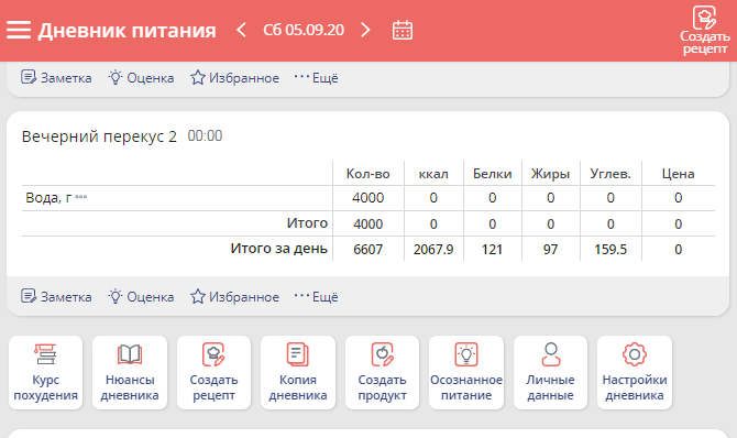 | Итого за день | 7480 | 2788 | 190 | 106 | 260 |