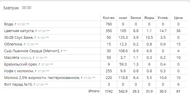| Кол-во | Калории | Белки | Жиры | Углеводы | |