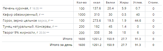 | Итого за день | 6260 | 2673 | 257 | 84 | 207 |