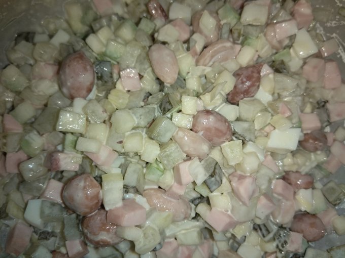 Увидела солёные огурцы развесные, захотелось, купила, приготовила салат на обед. Не так давно сделала для себя открытие, что если мелко порезать ингредиенты в салат, то он будет вкуснее) Наверное, многие давно в курсе, а я только недавно узнала)))