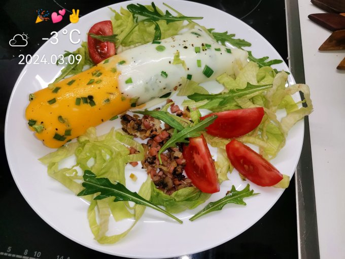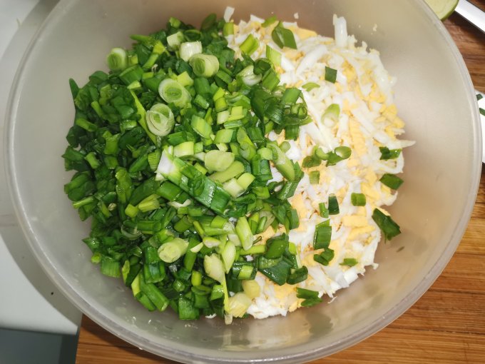 Поэтому утром сложился салат яйца, сыр, лук, майонез (можно сметану), черный молотый перец