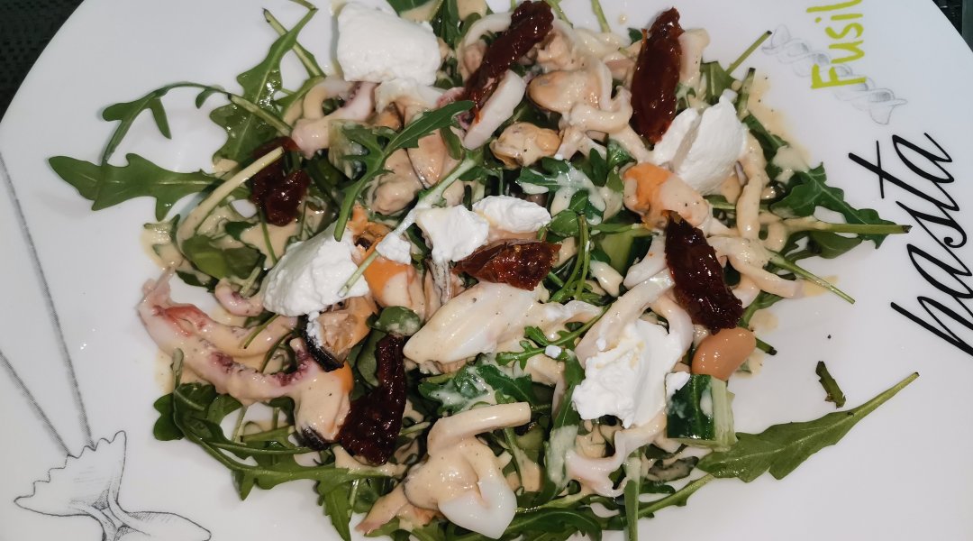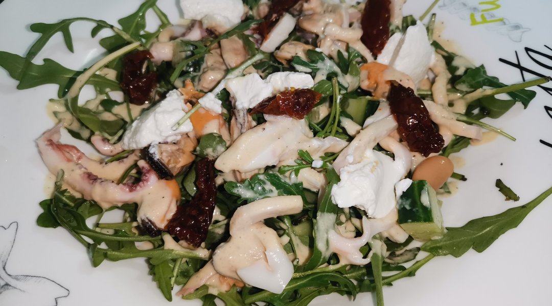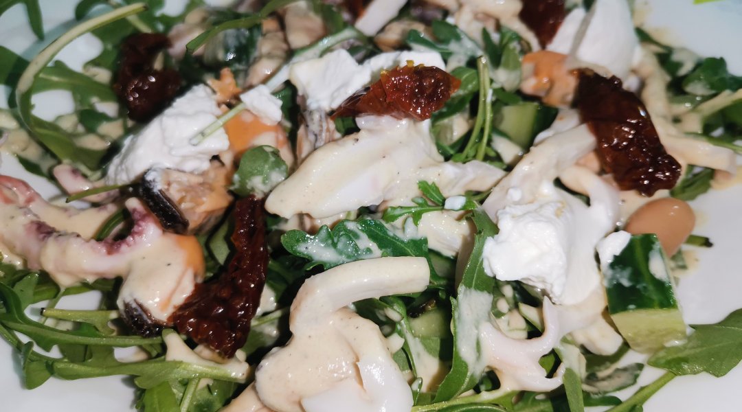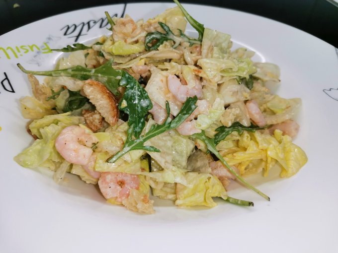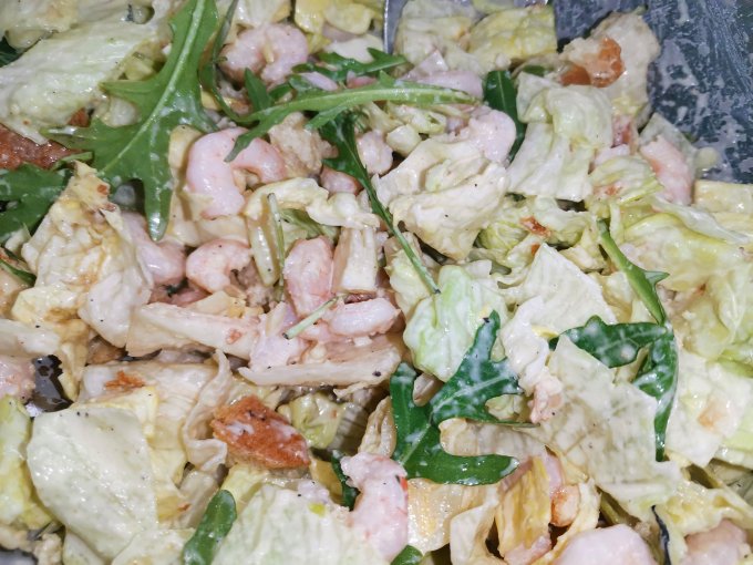 Гвоздь программы - салат из айсберга, креветок и с соусом домашнего приготовления.