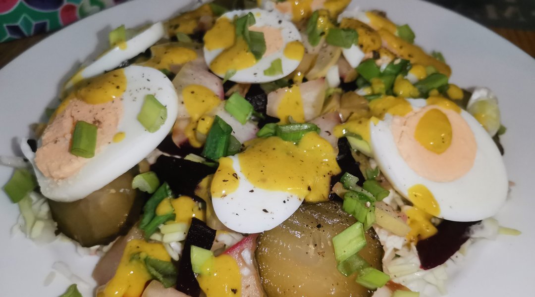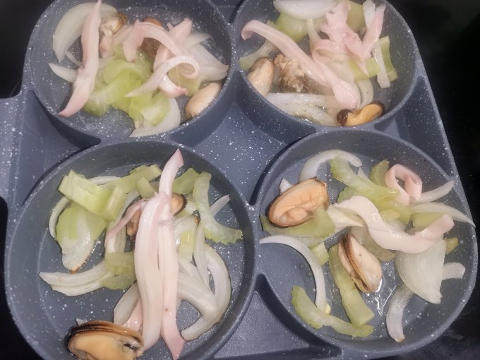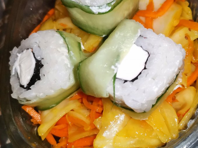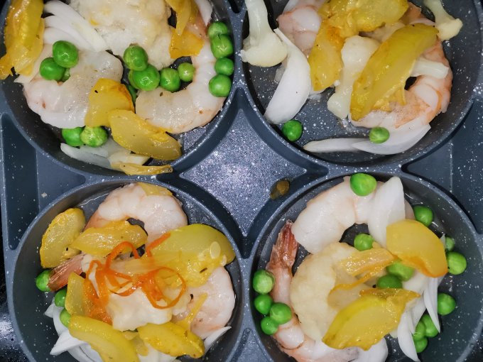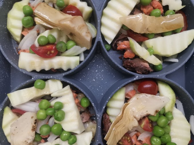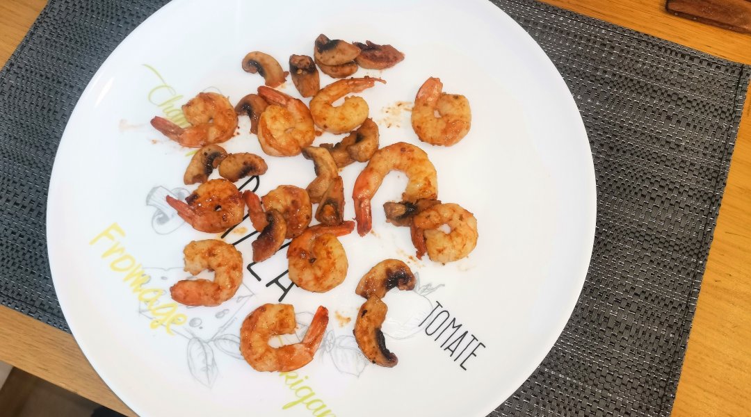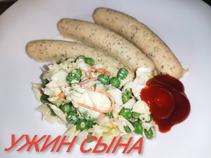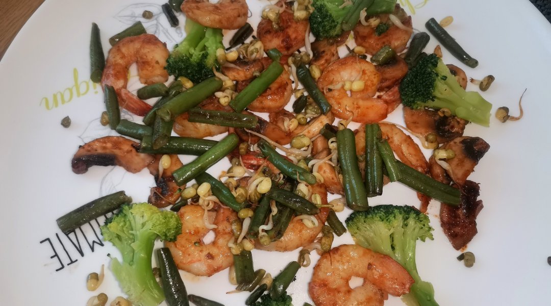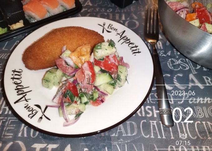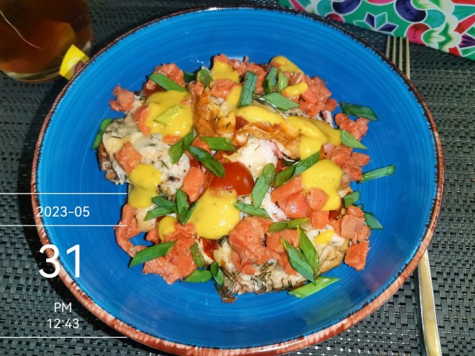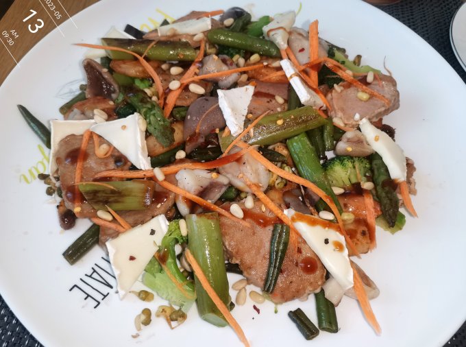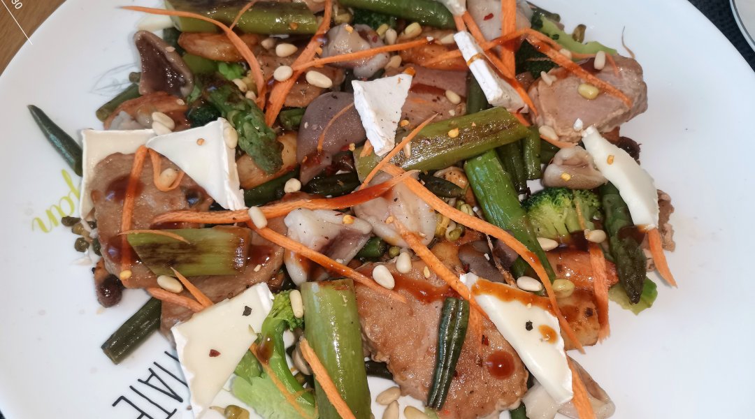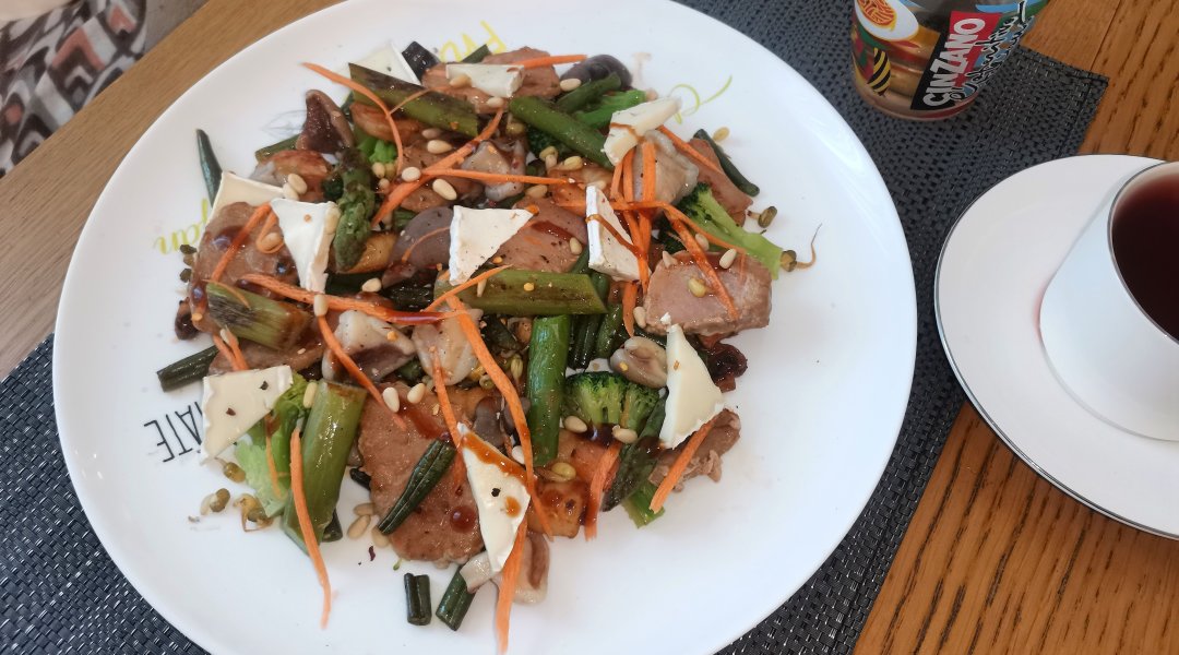 | Салат: креветки, тунец, спаржа, брокколи, фасоль, бри, грибы |