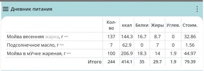 Сверила "показания" "мойвы жарка" из таблицы /137 - это сырой продукт. готового - 100 г/