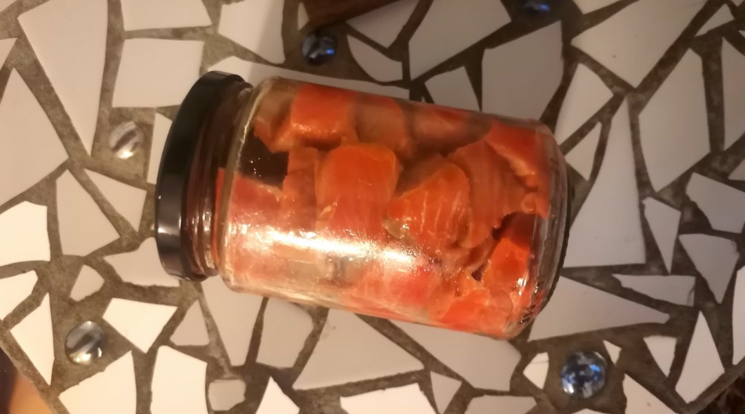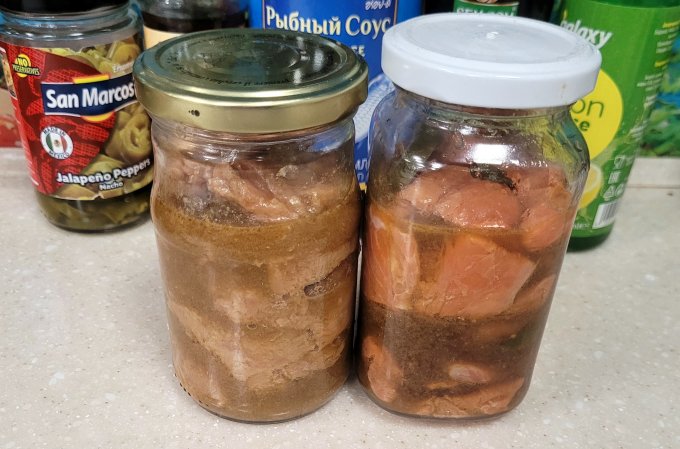 Уложить рыбу плотно в баночку. Залить маринадом под завязку.