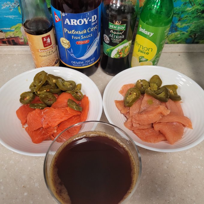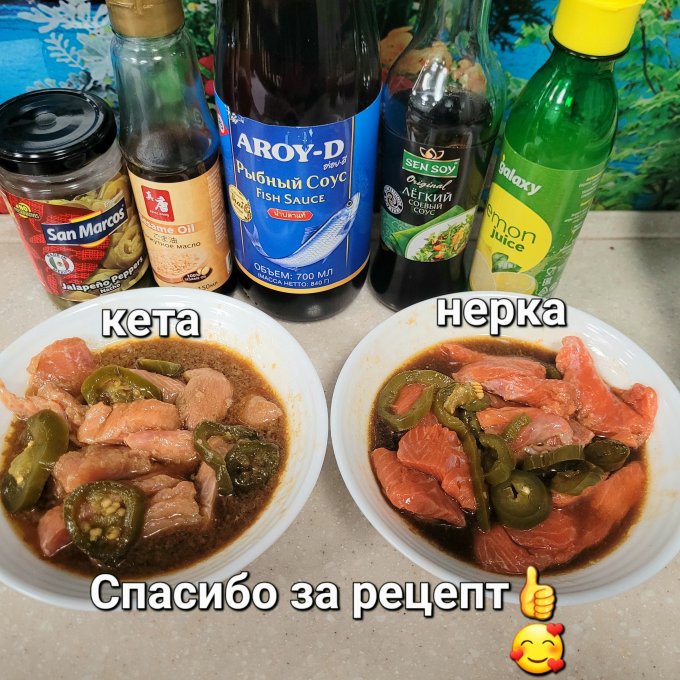 забыла рыбный соус...С неркой и с кетой пробую)) и уксуса у меня