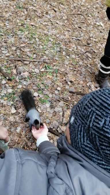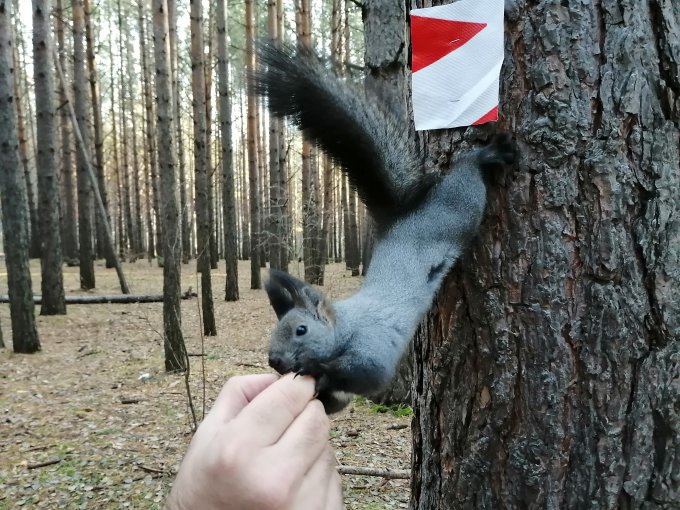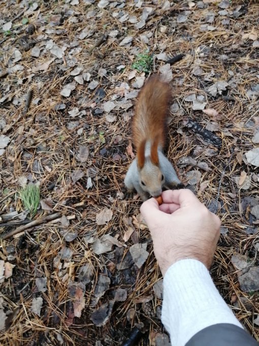 Удивительно, но родственники из Украины сказали что первый раз видят такое, чтобы белка залезла на руки.