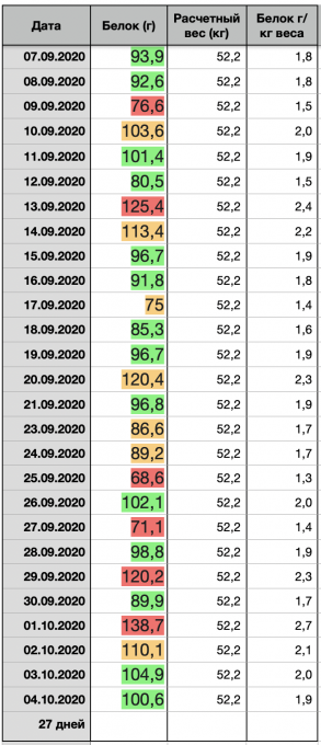 1. Общее изменение веса за 28 дней: -1 кг (с 54.4 кг на 53.4