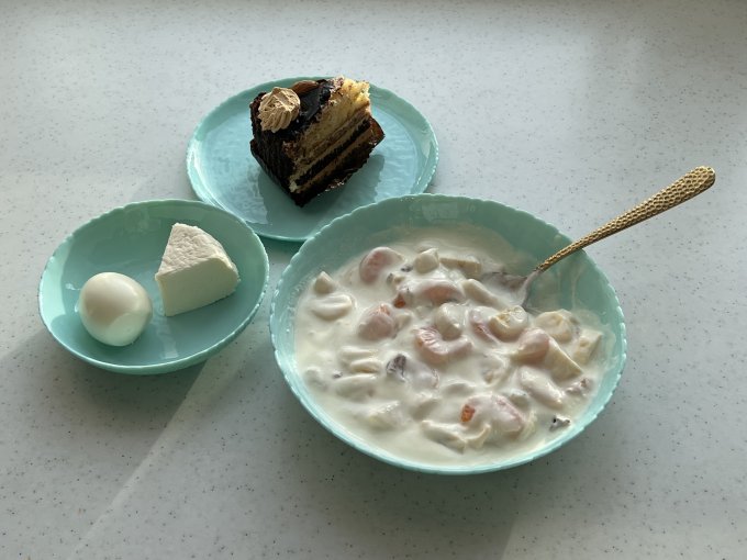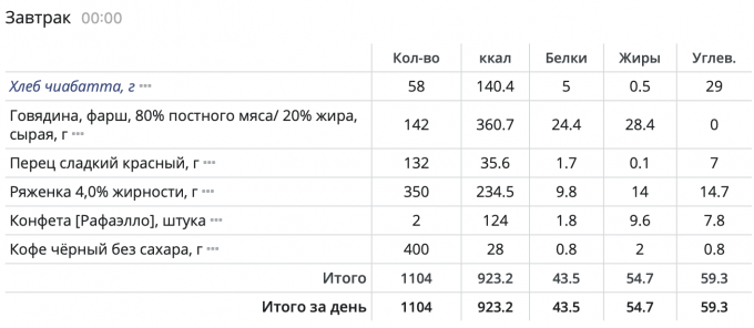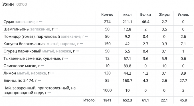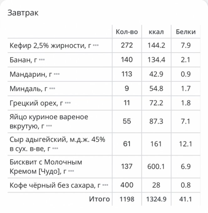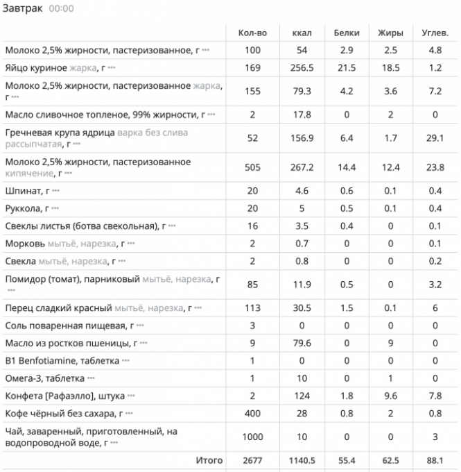 Утром, например, могу сделать молочную кашу на пол литре молока или фрукты с 300 гр йогурта, поехать на тренировку, после тренировки, пока еду на работу в машине, выпить 1 литр кефира, а вечером съесть ряженку или/и творог.