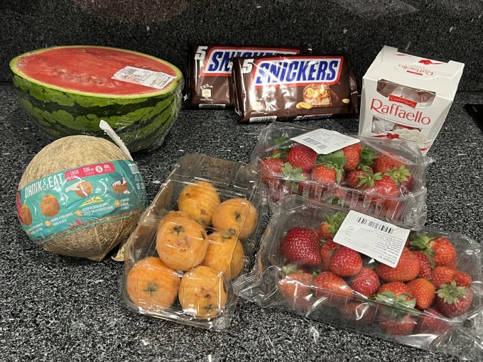 сыры, колбаса, яйца, выпечка, сладости, маслины, фрукты и овощи в