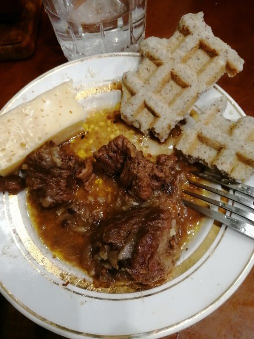 На фото тушёная говядина с луком и сливочным маслом, сыр, хлеб из орехов и яиц, минералка.