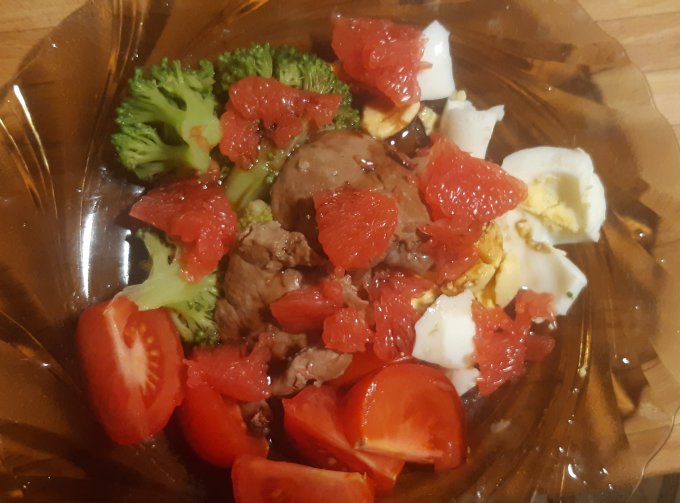 По 50 г: печени, брокколи, помидора, грейпфрута, одно яйцо и чайная