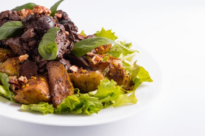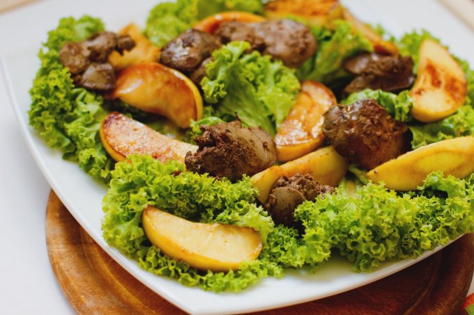 Очень вкусно тёплый салат из куриной печени и жареных (припущенных)