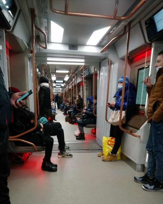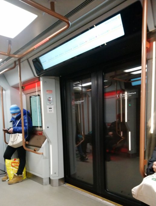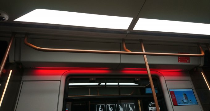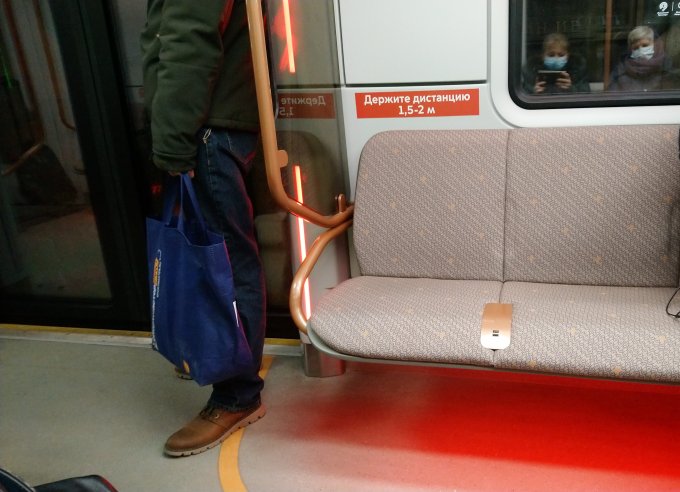 дверные проемы. Поручни тёплые. Сиденья из ткани мягкие. Около