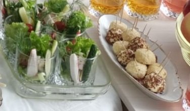 фуршетный стол. Напитки, канапешки всякие, салат в корзиночках и