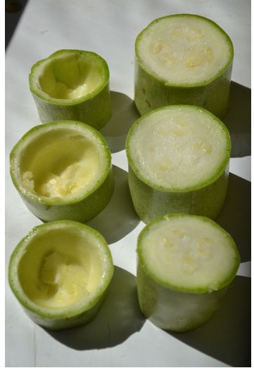 Заполнить фаршем кабачки-стаканчики и уложить их в смазанную маслом глубокую сковороду. Помидоры натереть на крупной тёрке, освободив их от шкурки, и этим соком залить кабачки. Готовить при закрытой крышке 25-30 мин на небольшом огне, за 10 мин до готовности положить лавровый лист. Готовые кабачки с подливом выложить на блюдо и на каждую порцию- их 9 - полить сверху столовую ложку сметаны, посыпать мелко нарезанными укропом и петрушкой. Количество подлива можно регулировать- если мало, то добавить. Приятного аппетита!