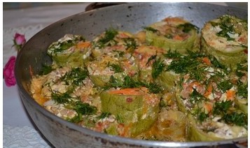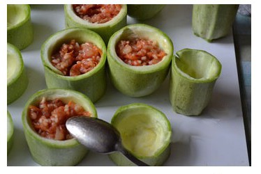 Фарш: Вынутую серединку и лук мелко нарезать, морковь нашинковать и пассеровать в растительном масле 3 мин. Мясо пропустить через мясорубку и перемешать с рисом, отваренным до полуготовности, добавить пассерованные овощи, посолить, поперчить и ещё раз перемешать.