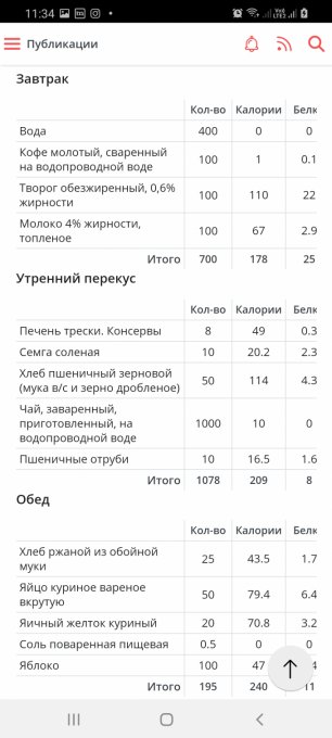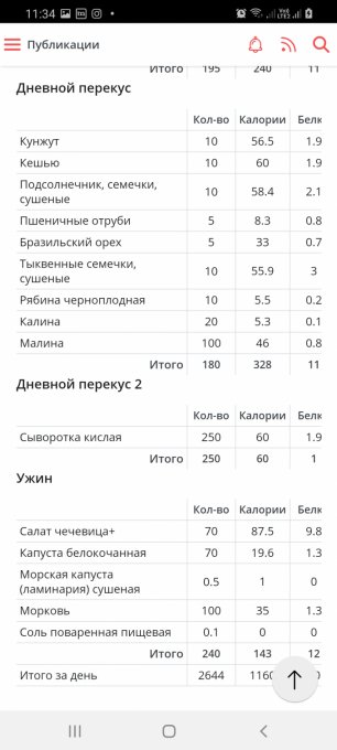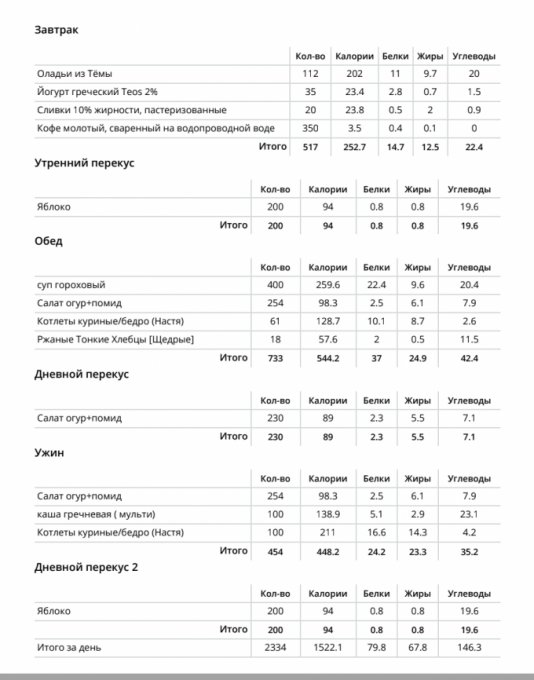 | Итого за день | 2644 | 1160 | 70 | 52 | 100 |