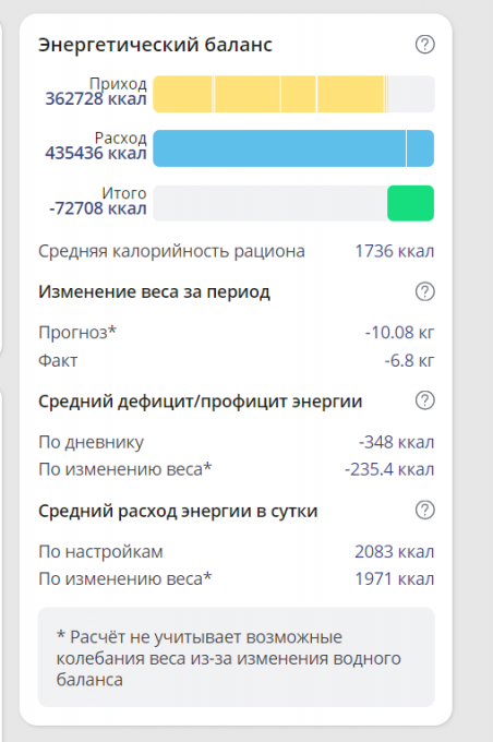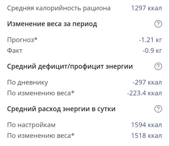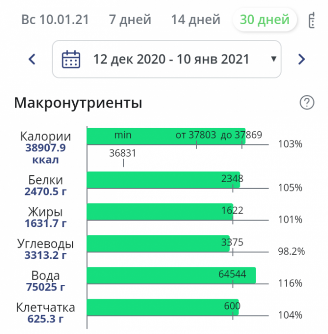 Вот итог моих стараний. Почти 1300 ккал каждый день честно