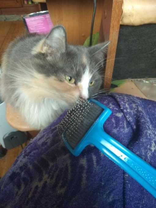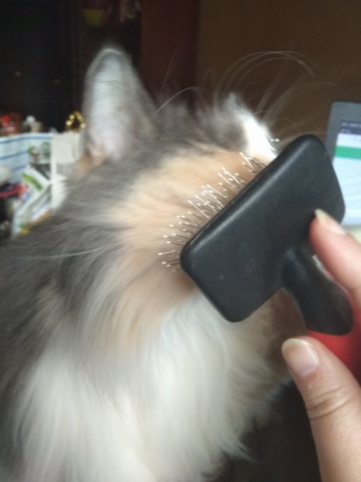 Пыталась приучать кошку к новой пуходерке. А то старая ее шубу уже