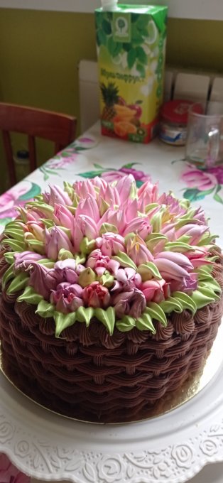 Сегодня день рождения моей начальницы, я для неё приготовила торт в качестве подарка. Она любит домашние торты, вот я и на выходных испекла и сегодня подарила. Хорошо что не пришлось придумывать и искать что бы такое подарить, работаем вместе 12 лет, всё дарено- передарено, а лучший подарок сьедобный, вкусный, натуральный и сделанный своими руками. Всё довольны и счастливы. Фото на работе сделала, успела сфоткать пока целый торт был. Попробовала малюсенький кусочек, очень вкусно получилось.