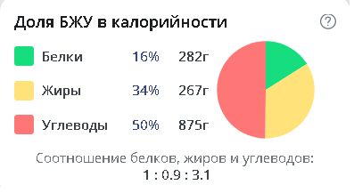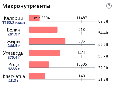 -4000 калорий за неделю. Углеводы, в основном вредные.Нутриенты ниже