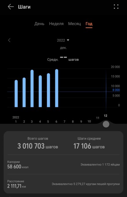 3 млн шагов за полгода, более 2х тысяч километров пешком. Самым активным пока получился июнь: среднее количество шагов в день - 19978