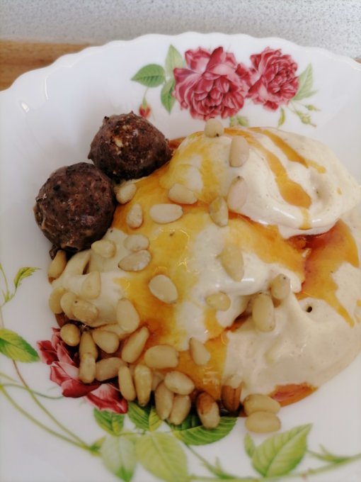 С утра банановое мороженое с сиропом топинамбура и кедровыми орехами.