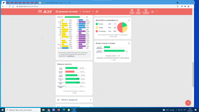 Сегодня рабочий день, потом дача. Заполняю дневник и спать... Может по калориям и многовато, зато диаграммка жиров и соотношение калия к натрию радуют:)