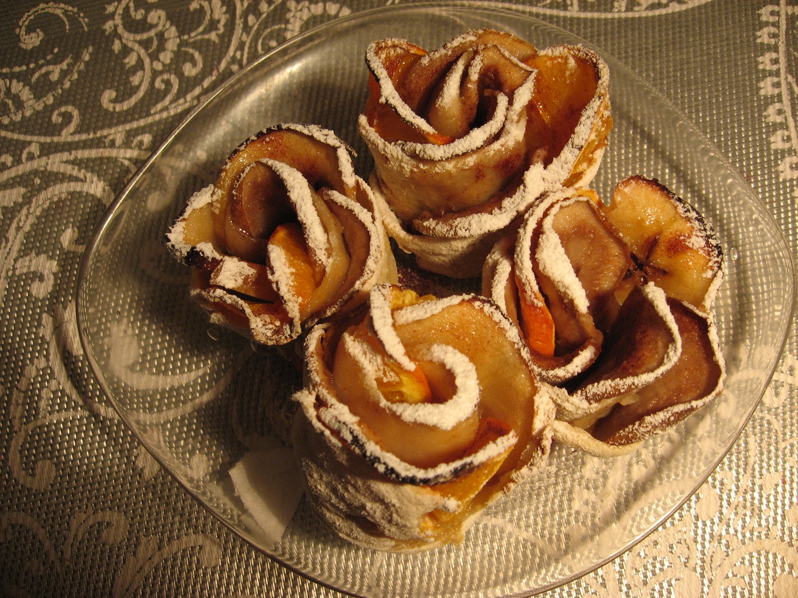 Раскатать на 14 полосок, на них выложить нарезанные очень тонкими кругами фрукты, завернуть рулетиками,придавая форму бутона розы.Можно фрукты присыпать сахаром с корицей. Защипнуть снизу и поставить или в формочки для кексов, или просто на фольгу( что-бы не развалились). Выпекать 20-25 мин,, после присыпать сахарной пудрой.