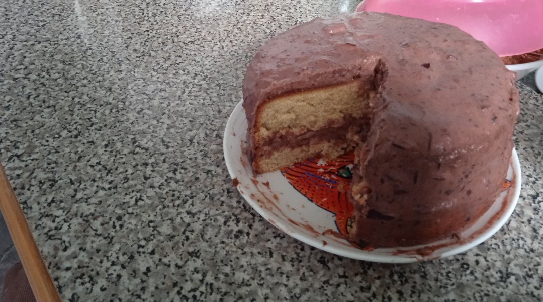 Бисквит достаем из формы, разрезаем, наносим на нижний корж крем,