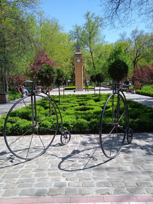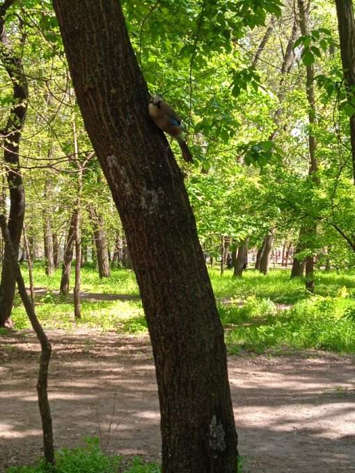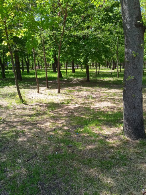 Работники парка следят за газоном и чистотой дорожек. Дети бегают