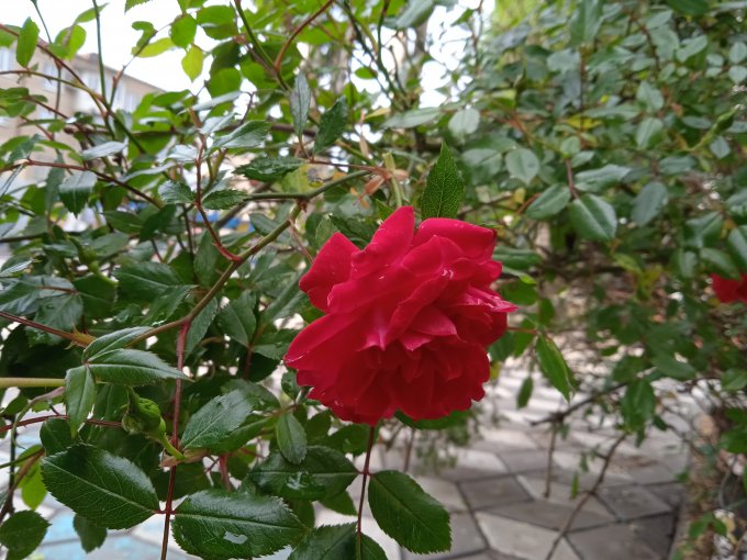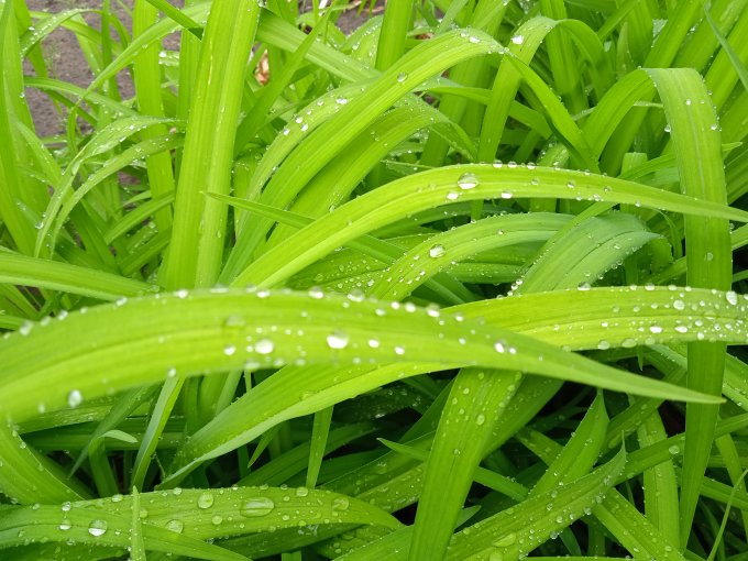 капельках воды, что остались на листьях и цветах.