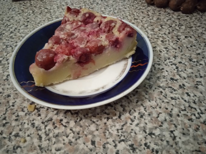 пирог. Необычная текстура, вишнёвая кислинка. Наверно, потом