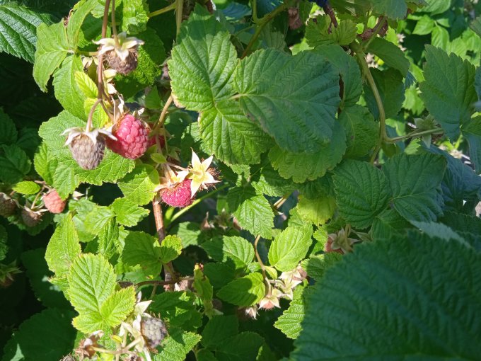 клубника, смородина чёрная, крыжовник, горох. Пошла первая малина.)