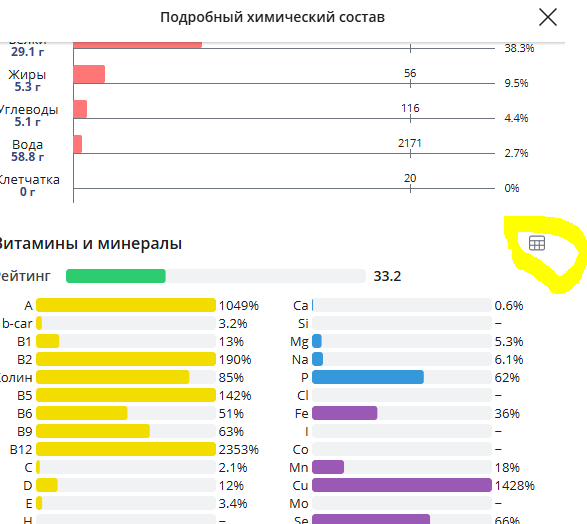 В карточке продукта, чуть ниже цифр с калорийностью есть кнопка "показать все нутриенты", кликнете на нее и весь список откроется.