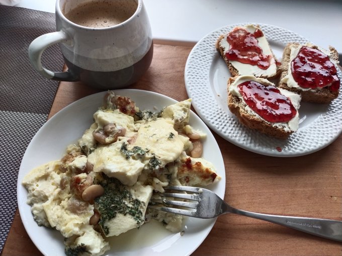 Сегодня потчуюсь омлетом с фасолью (человек требует белка!), Капучино с корицей, бутерброды с маслом и клюквенным джемом.