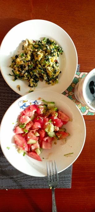 помидор с огурцом. И яйцо с пореем жарила. На обед бульон из курицы