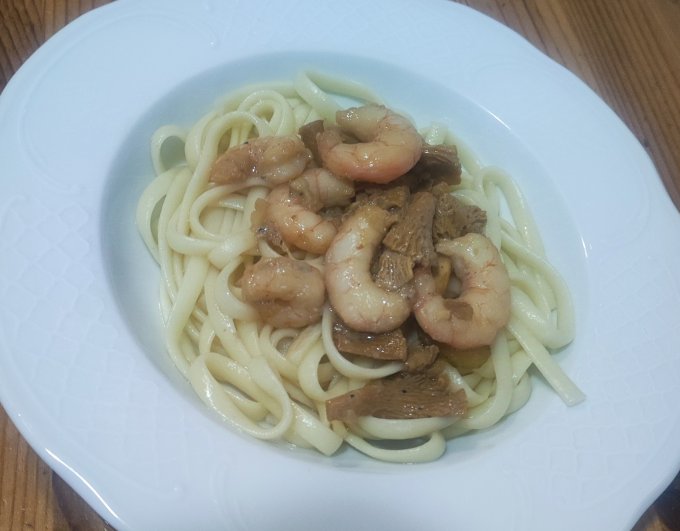 Между дождиками муж успел в лесок, принес лисичек. Сегодня на обед: паста с лисичками и креветками.